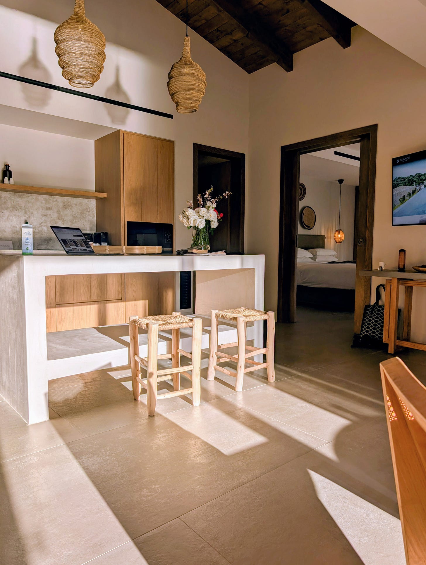 I don’t know what you would call Eliamos. It’s a hotel with villas, I suppose. But a hotel where you barely see anyone else; and with villas that are like stepping into an Architectural Digest magazine cover. The outdoor gym is always blissfully empty; the restaurant never heaving - even when the place is full, as was the case when I was there. You never have to wait for an electric bike to become available and the beach is a slow, meditative walk down a small hill, which is empty when you get there except for a lone black cat who eyes you up furiously.