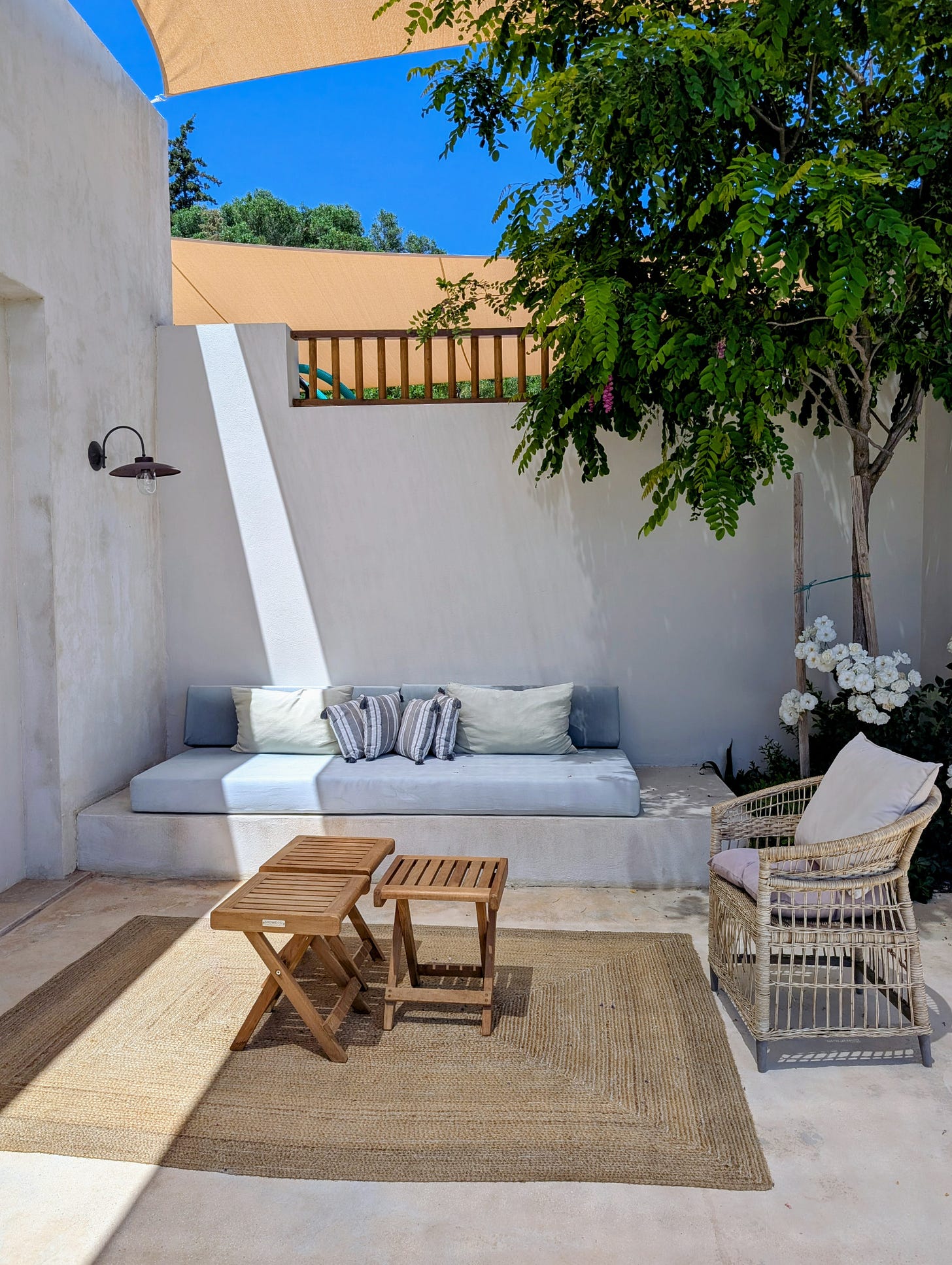 Though the three villas are side by side, each is separated by a generous, lovingly planted garden filled with sweet roses, pale pink gaura and delicious, herb-scented salvias. (I am a gardener and know how hard this is to achieve in a place like Greece.)